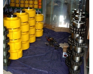 鏈條聯(lián)軸器具有結(jié)構(gòu)簡單(四個件組成)、裝拆方便、拆卸時不用移動被聯(lián)接的兩軸、尺寸緊湊、質(zhì)量輕、有 補償能力、對安裝精度要求不高、工作、壽命較長、成本較低等優(yōu)點。滾子鏈聯(lián)軸器 可用于紡織、農(nóng)機、起重運輸、工程、礦山、輕工、化工等機械的軸系傳動,適用于高溫、潮濕和多塵工況環(huán)境,不適用高速、有劇烈沖擊載荷和傳遞軸向力的場合,鏈條聯(lián)軸器應(yīng)在良好的潤滑并有防護罩的條件下工作。鏈條聯(lián)軸器是利用公用的鏈條,同時與兩個齒數(shù)相同的并列鏈輪嚙合,不同結(jié)構(gòu)型式的鏈條聯(lián)軸器主要區(qū)別是采用不同的鏈條,常見的有雙排滾子鏈聯(lián)軸器、單排滾子鏈聯(lián)軸器、齒形鏈聯(lián)軸器、尼龍鏈聯(lián)軸器等。雙排滾子鏈聯(lián)軸器性能優(yōu)于其他結(jié)構(gòu)型式的聯(lián)軸器,為 廣泛采用KC滾子鏈聯(lián)軸器,我國亦已制訂為 標(biāo)準(zhǔn)GB6069-2002 。